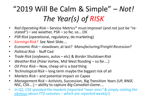 Union Pacific also suffered from severe headwinds, mostly but not entirely in “Energy” (coal down 22%, sand fully 53%) and “Premium” (down 15%); overall volumes were down 11% (double-digit!), revenues -9%. EPS was off 5%. But charged by a $535mm productivity gain (versus a goal of $500mm) and (fueled by) a 17% drop in the workforce, their OR actually declined 190bps to 59.7%. That success, and the plans for another ~$500mm in productivity (and an 8% headcount reduction) – as well as a guidance of an increase in volume (second-half weighted, to be sure, although the spring flooding last year will help 2020 comparisons), led to the many (many) questions on UNP’s “conservative” guidance (~160bps in OR). UNP produced a ROIC of 15.1%, down only 0.1 points – and thank you UNP for reporting this!